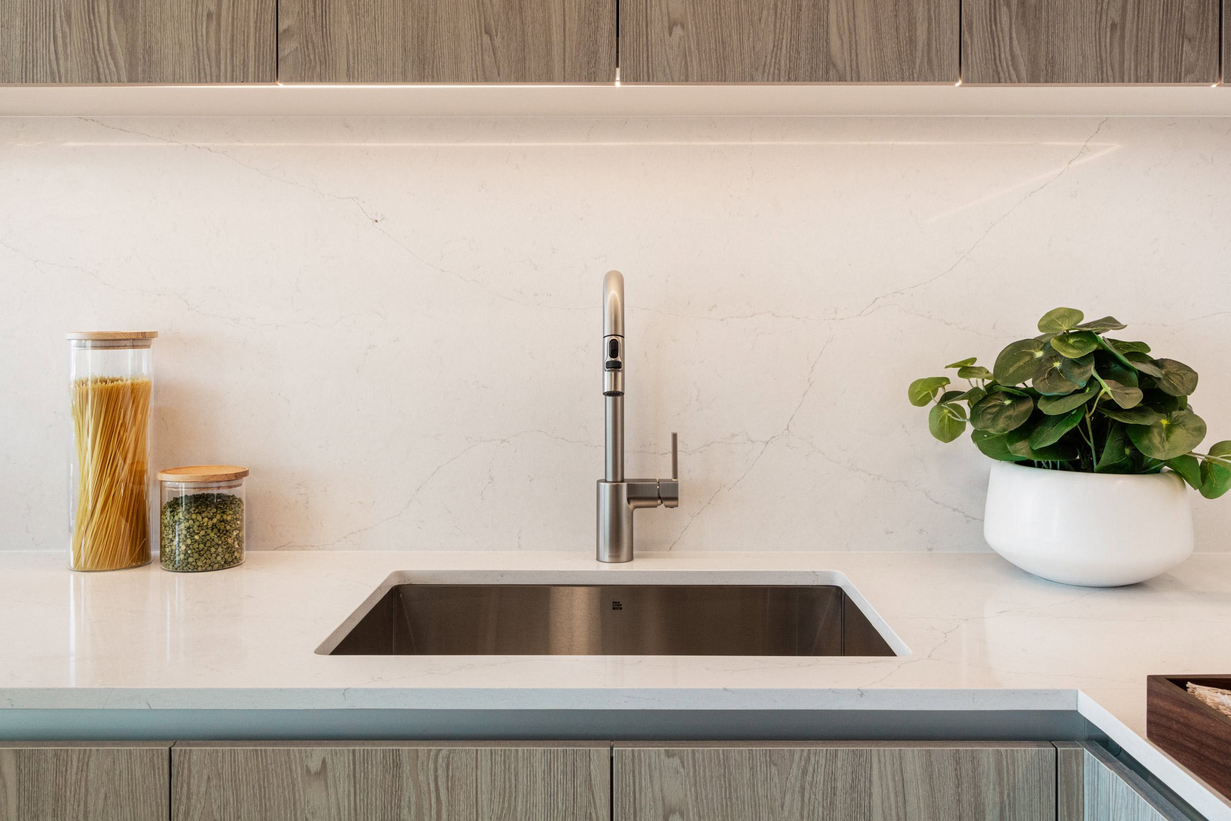 A clean-lined cooking zone with quartz surfaces, gas range, and natural light.