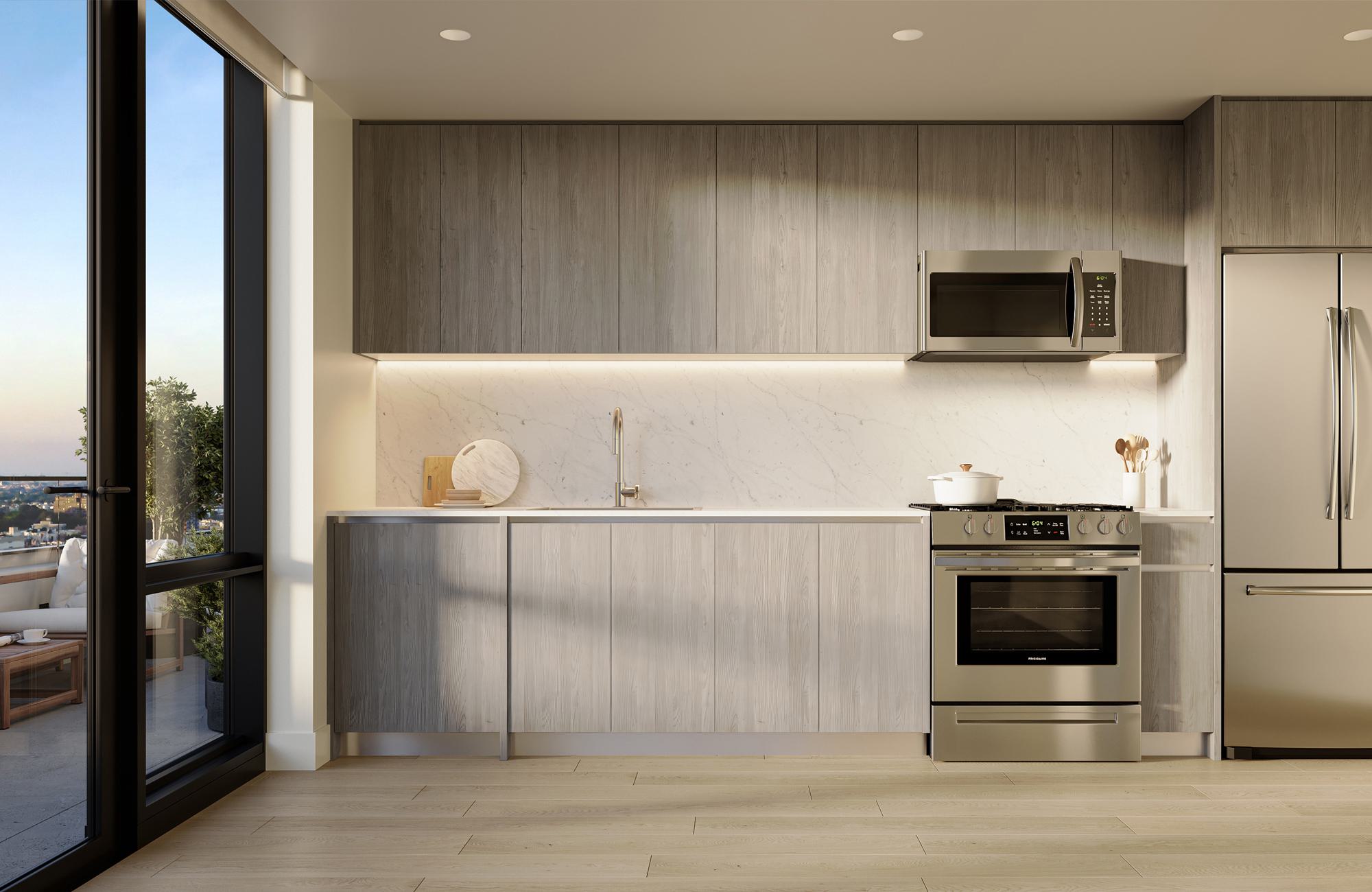Sleek, open penthouse kitchen with modern appliances and terrace access.